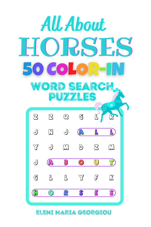 This beautiful COLOR IN WORD SEARCH PUZZLES book is all about HORSES!