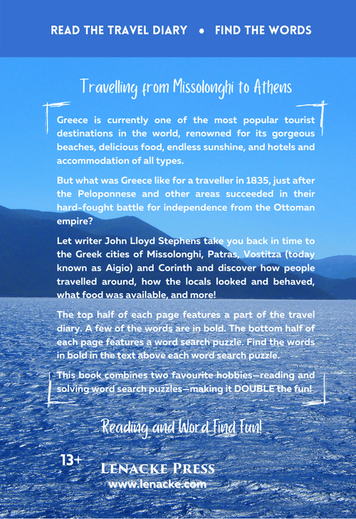 The Greek travel diaries by John Lloyd Stephens featured in this book recount his trip to Greece in 1835 and, more specifically, his visits to Messolonghi, Patras, Lepanto, Vostitza and Corinth before he finally reaches Athens. Stephens’ engaging writing will make you want to read the whole book in one sitting. And the Word Search puzzles will also be fun to solve, making it a great way to pass the time—and maybe help improve your spelling along the way!