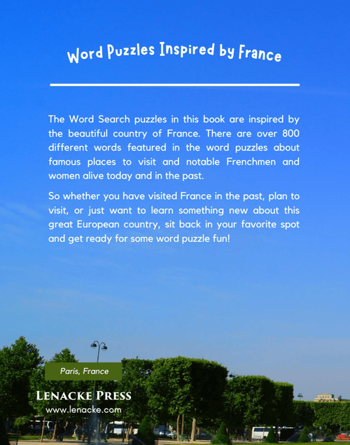 There are over 800 different words featured in these word search puzzles about famous places to visit and notable Frenchmen and women alive today and in the past.