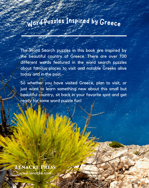 There are over 700 different words featured in these word search puzzles about famous places to visit and notable Greeks alive today and in the past.