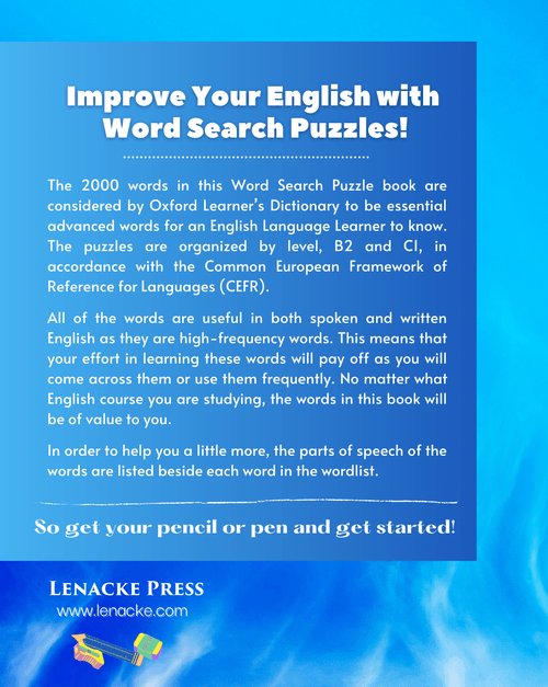Use this volume of Word Search puzzles to help you learn and memorize the spelling of a small set of words each time. The words used in this book are taken from the B2 & C1 levels and they align to the Common European Framework of Reference (CEFR).